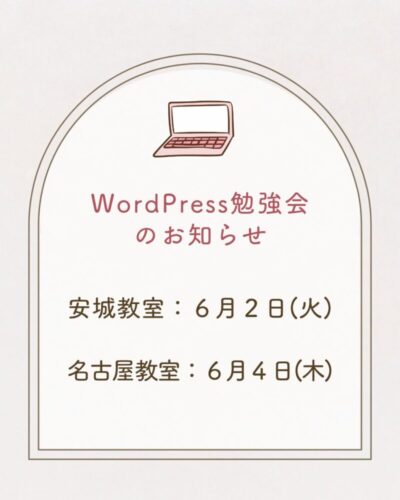 ※この勉強会は現在ワードプレスのサイトを運用している方が対象です 年に2回開催している勉強会みなさんにお会いできるのを楽しみにしています☺️ 名古屋教室 【日時】12月10日(水)午前の部 10:30〜12:30 残席1 […]